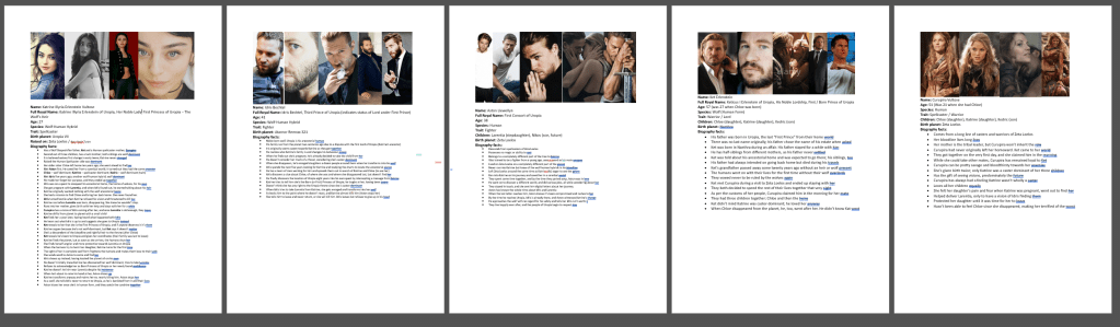 For every story I write, I have at least one document relating to the characters, containing details (name, age, species, family, powers, facts…). Here’s an example from my short story, The Wolf’s Heir: Katrine’s Awakening. There are no powers, only biographical facts because the Witches cast spells in that story. Every “cast member” – this is fantasy casting, has its face, but only Kat and Idris were changed. Idris was wholly reinvented for this story. The original character, written by someone else, wasn’t even half as bad as Idris. Her heart did end up broken, and he wasn’t a nice guy in the end, having been involved with a girl she considered to be her little sister while being with her… Yeah, so I chose to exaggerate the story.
