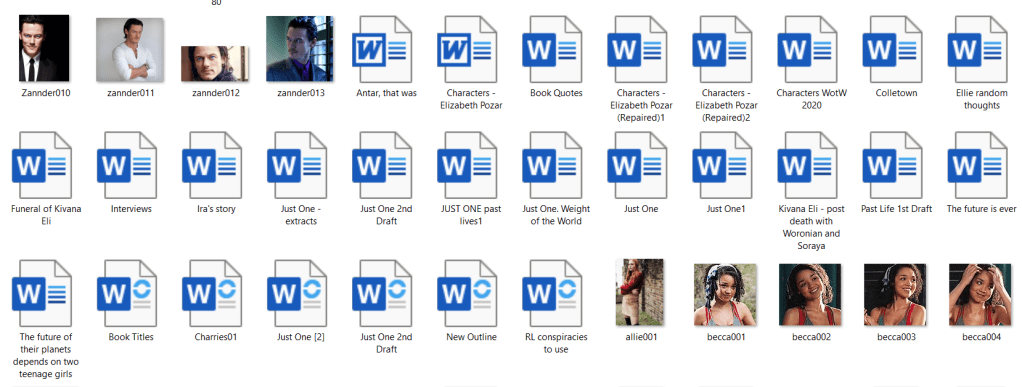 Let’s take a look at another project. Just One is a far longer process, so it contains many more files than The Wolf’s Heir, and since the story doesn’t end with just the one book, some things in this folder relate to the future books. “Characters WotW 2020” is the original character list for Just One: The Weight of the World (book three).